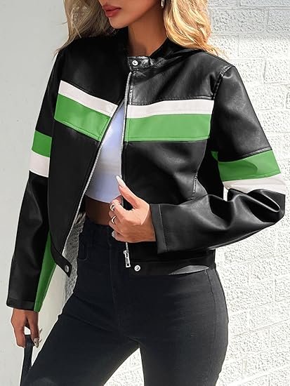 Add bold edge to your look with this Women’s Cropped Faux Leather Moto Biker Jacket, featuring a trendy color block bomber design.