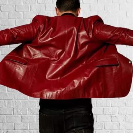 Crafted from genuine red lambskin leather, this stylish men’s blazer features a sleek button closure, tailored fit, and smooth lining — perfect for adding bold sophistication to any outfit.