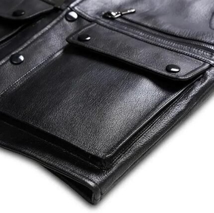 Durable men's genuine leather motorcycle vest with sleeveless design and multiple pockets. Perfect for bikers seeking style, comfort, and functionality.