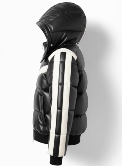 Elevate your winter look with this Black and White Leather Puffer Jacket. Designed with a detachable hood, bold contrast stripes, and cozy padded insulation, it blends sporty retro style with premium warmth and comfort.