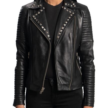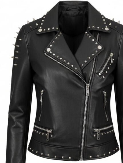 Unleash your inner rebel with this black genuine leather biker jacket for women, featuring bold studs, sharp spikes, and a fierce punk-inspired design. Crafted for attitude and built to last.