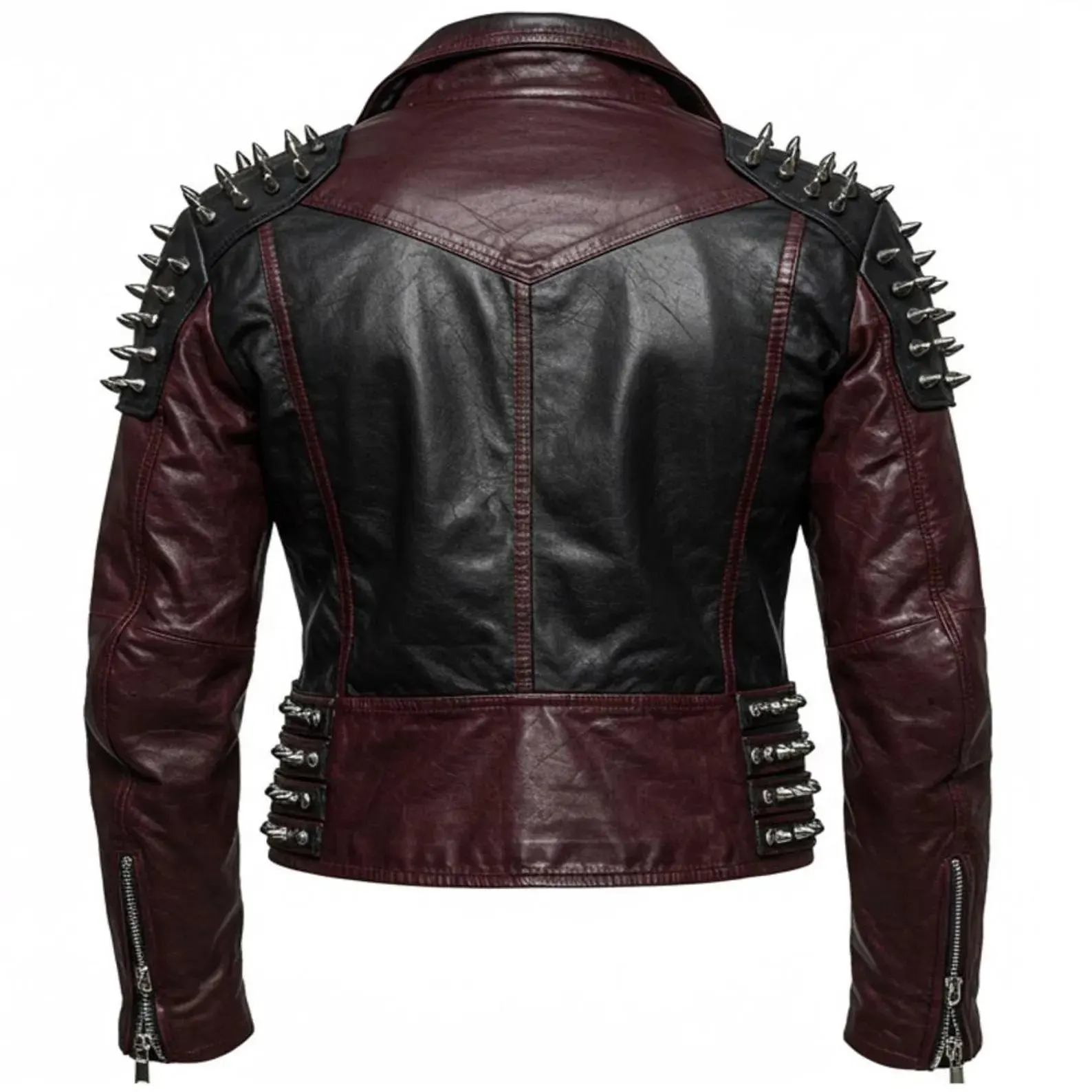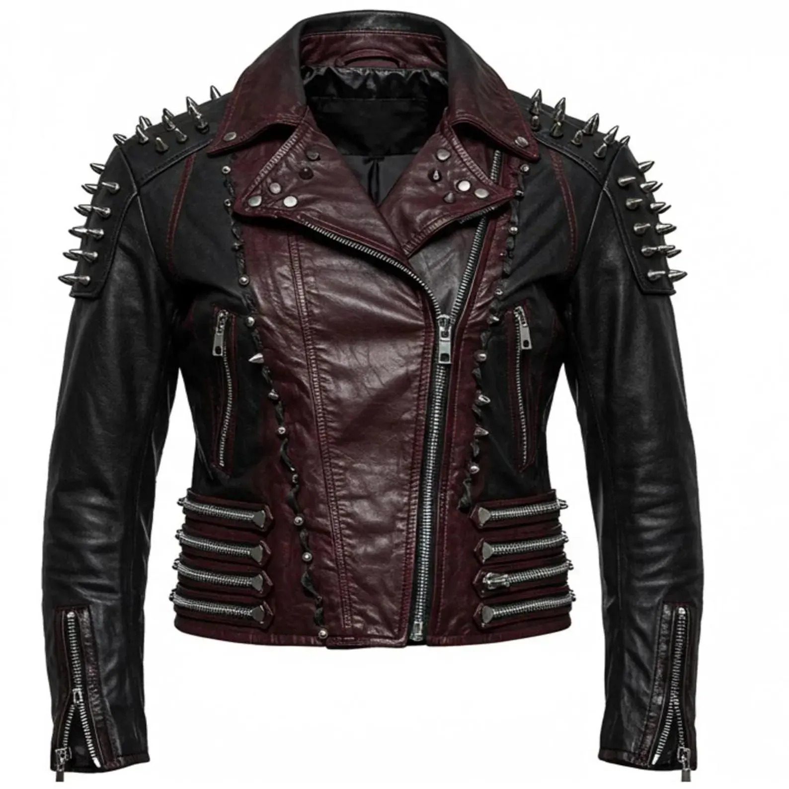 Menβs black and burgundy studded leather biker jacket featuring metal spikes, premium cowhide, zip pockets, and bold rockstar style. Perfect for riders and fashion rebels.