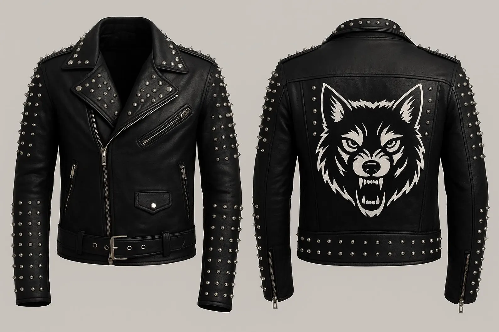 Handmade black leather studded wolf jacket in biker, punk, and gothic style, crafted for a bold and rebellious statement look.