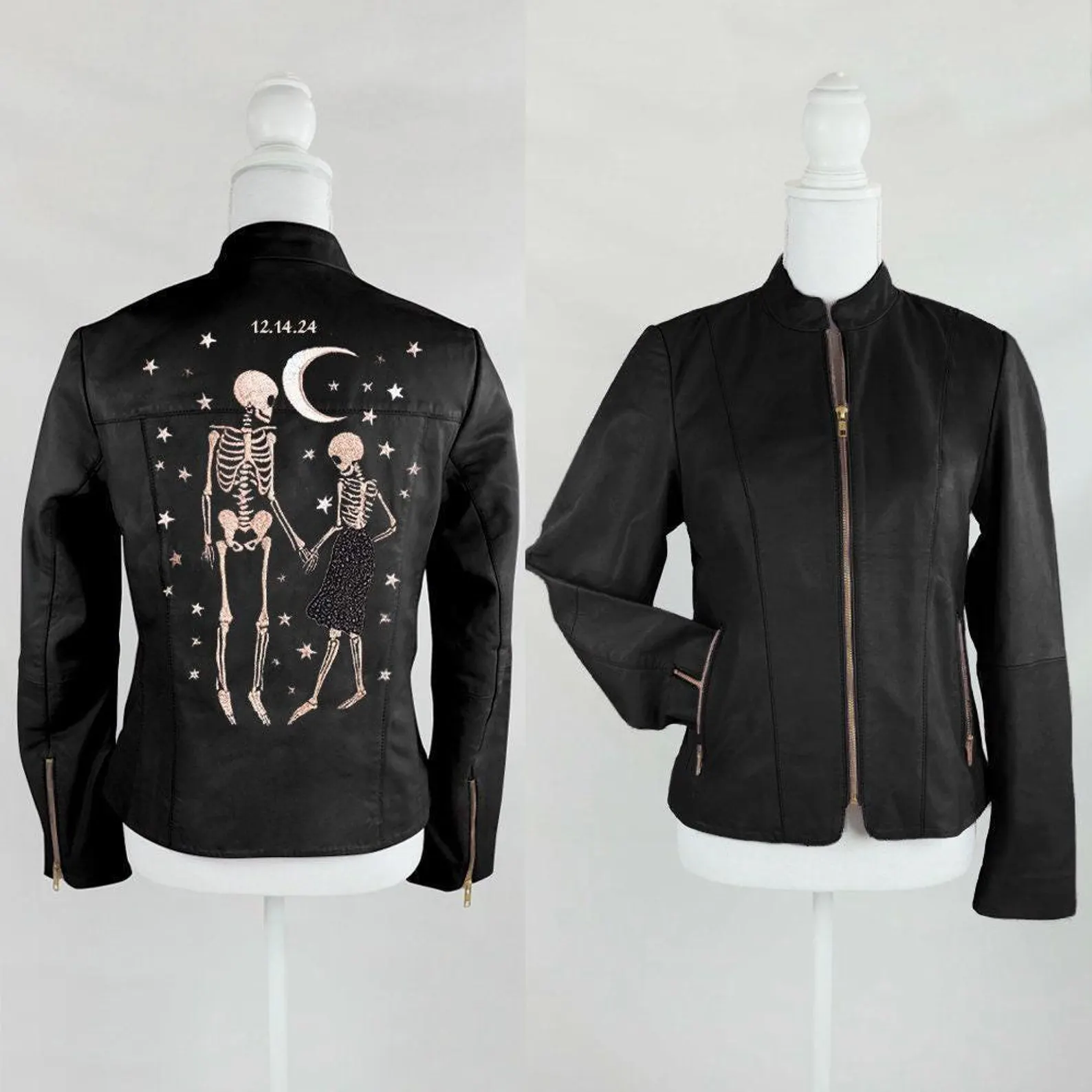 Make a bold statement with this Custom Skeleton Design Leather Jacket featuring detailed embroidery on premium genuine leather. A perfect fusion of edgy biker attitude and artistic craftsmanship.