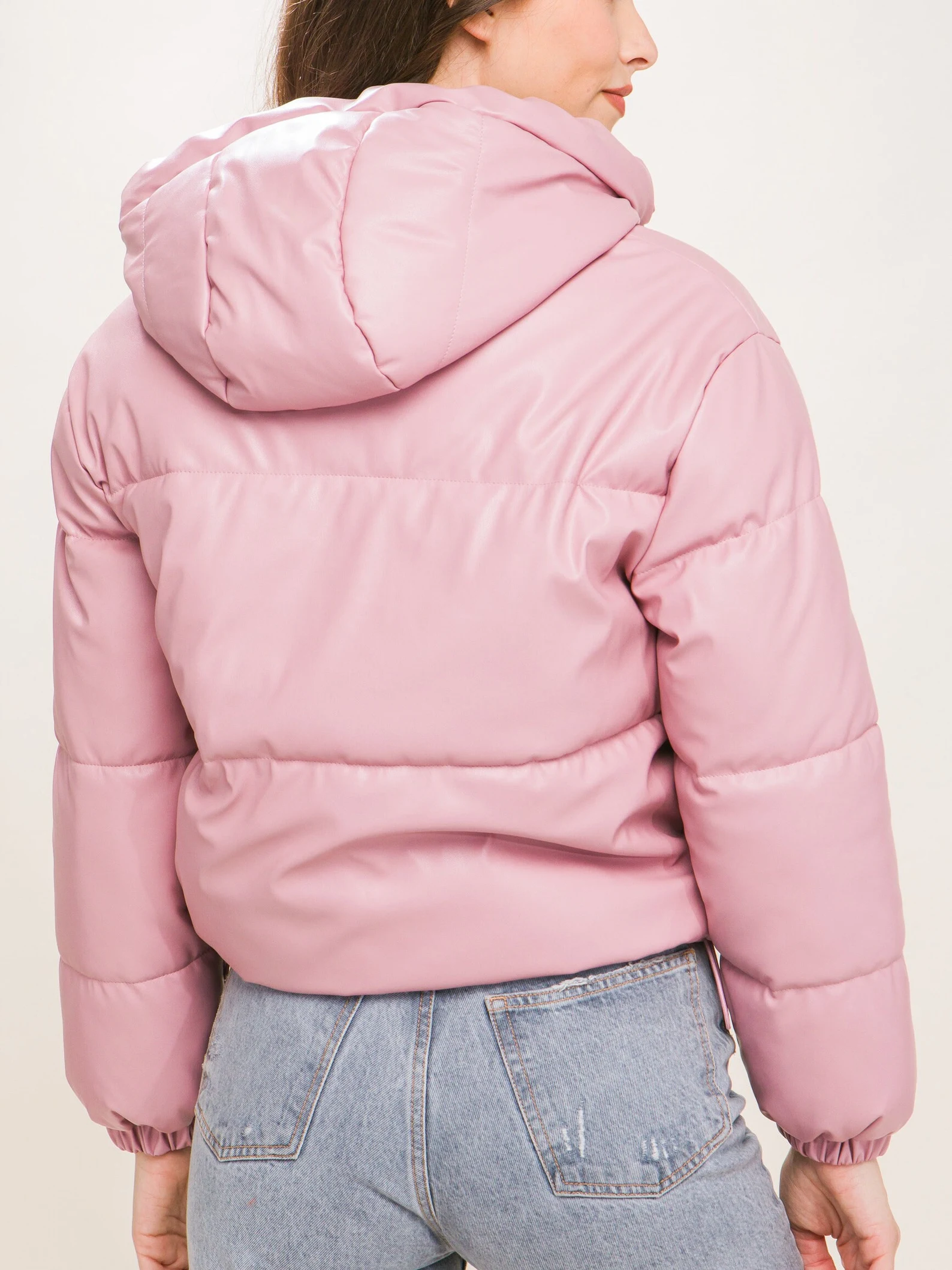 Warm and stylish, this Faux Leather Puffer Jacket with Hoodie features quilted padding, elastic cuffs, and side pockets for a sleek, versatile winter look.