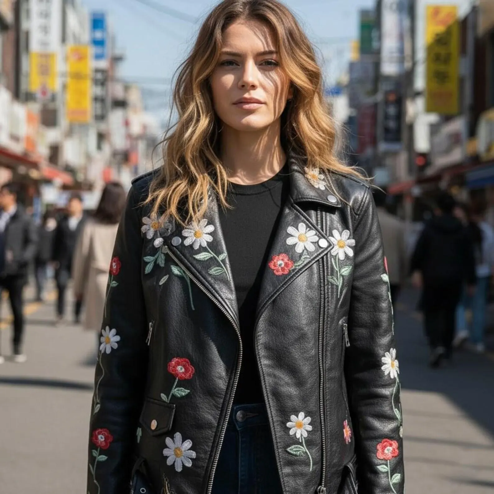 Floral Embroidered Leather Jacket Rocker Biker Style Jacket. This rocker biker-style jacket features detailed floral embroidery that contrasts beautifully against its sleek leather base, creating a perfect balance between femininity and rebellion.