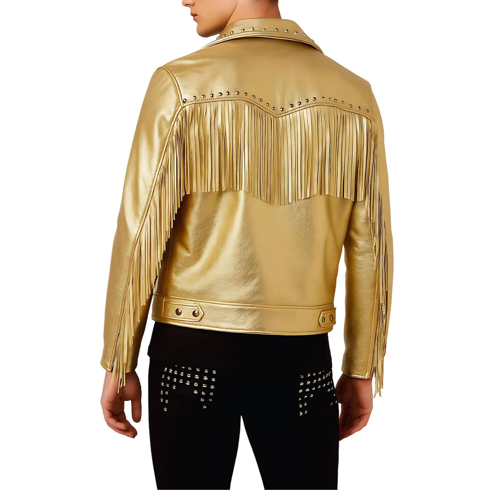 Men’s gold fringe leather biker jacket with western studs. Handmade rock-style design for a bold, edgy statement look.
