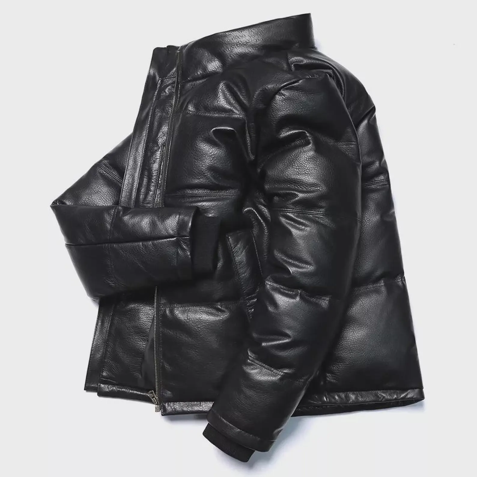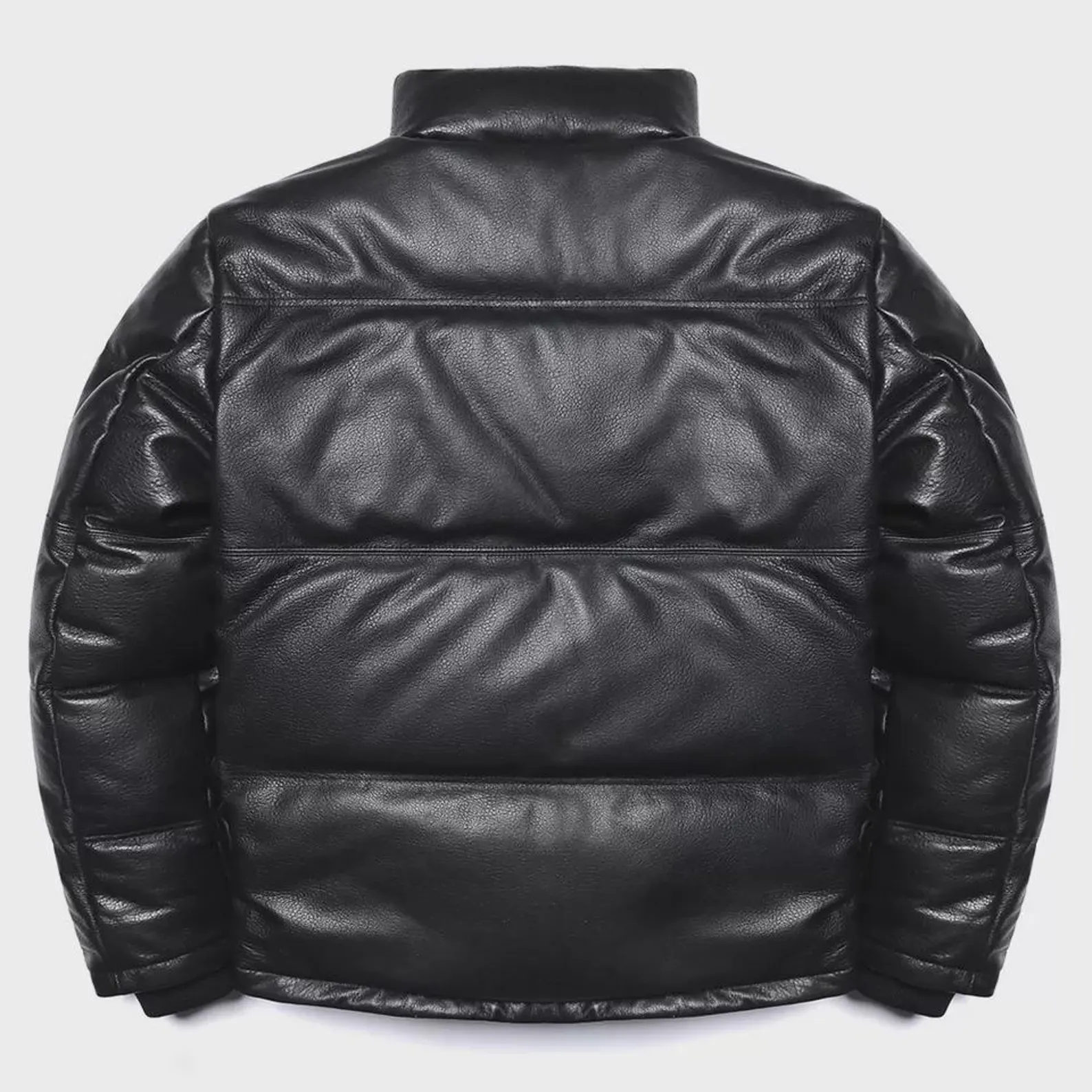 Handcrafted from premium black lambskin leather, this padded quilted down puffer jacket offers exceptional warmth and style. Featuring a smooth zipper closure, high collar, and sleek finish, it’s the perfect blend of luxury and winter functionality.