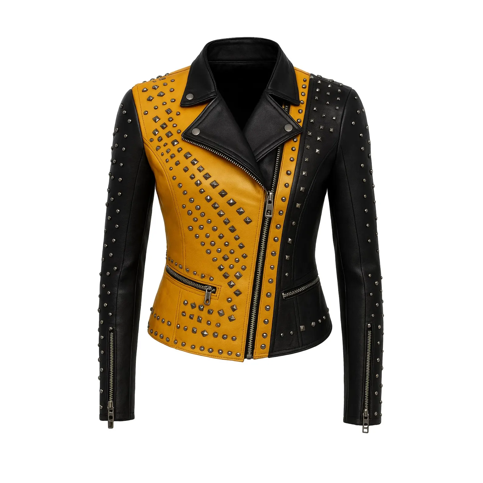 Handmade Yellow & Black Studded Cowhide Biker Jacket