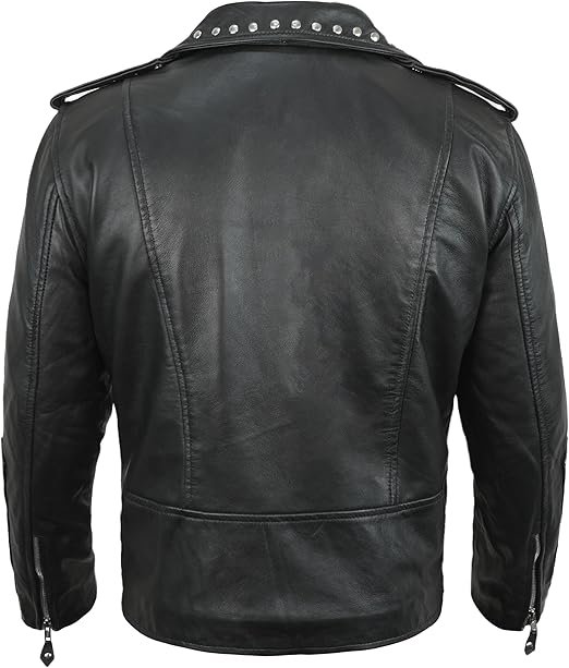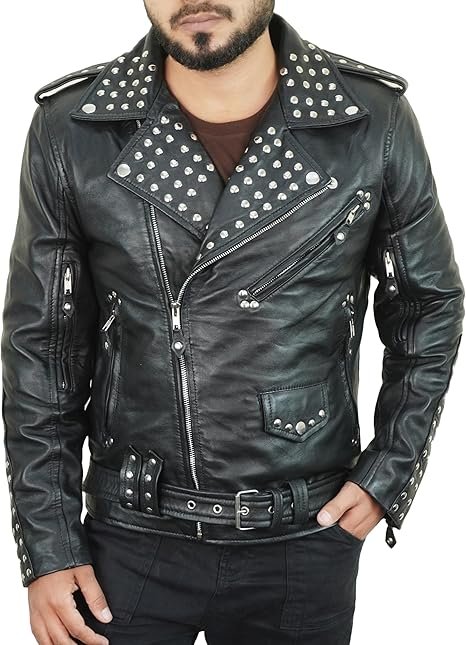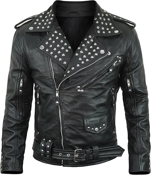 Men’s Black Leather Biker Jacket with Silver Studded Collar and Belted Waist. Crafted from premium genuine leather, this jacket is built for durability and style, combining classic biker attitude with striking silver stud embellishments that command attention.
