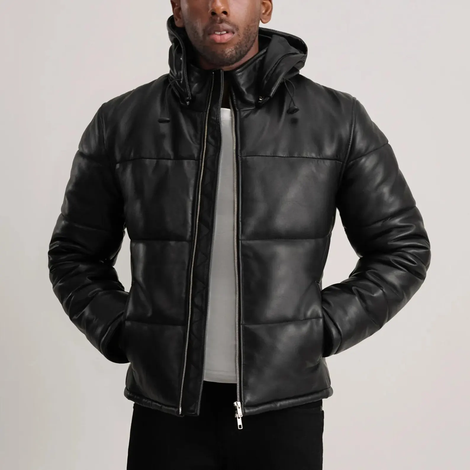 Men’s Black Leather Puffer Jacket Warm Winter Coat with Detachable Hood, designed for warmth, comfort, and modern appeal. Crafted from premium genuine leather, this jacket features a sleek quilted puffer design that provides excellent insulation without added bulk. The detachable hood offers versatile wear, allowing you to transition easily between casual and refined looks. With a smooth front zipper closure, soft inner lining, and practical pockets, this jacket delivers both functionality and fashion. Perfect for cold-weather city wear or outdoor adventures, it’s a must-have winter essential for every modern man.