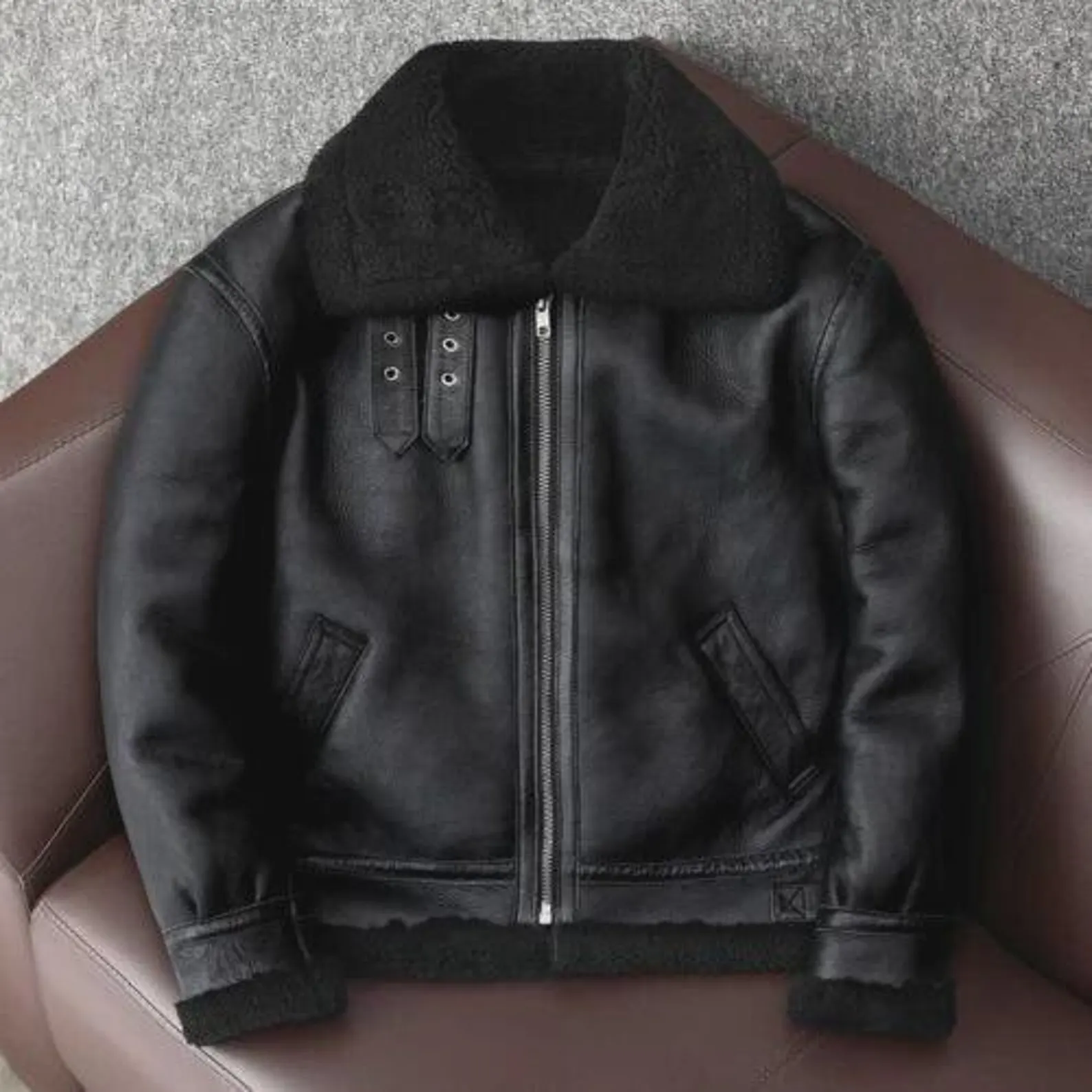 Men’s Black Shearling Aviator Jacket Lambskin Leather Bomber Coat , crafted from premium lambskin leather for a sleek, luxurious finish. This bomber-style coat blends timeless aviator aesthetics with modern craftsmanship, featuring a plush shearling lining that delivers exceptional warmth and comfort. The rich black tone enhances its bold, masculine appeal, while the structured fit and durable build make it ideal for cold-weather wear. Designed with meticulous attention to detail, it includes a front zipper closure, adjustable straps, and functional pockets — perfect for men who value both style and practicality.