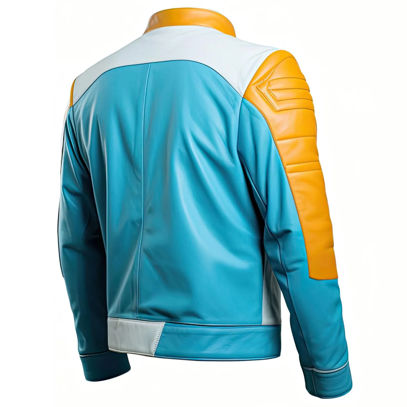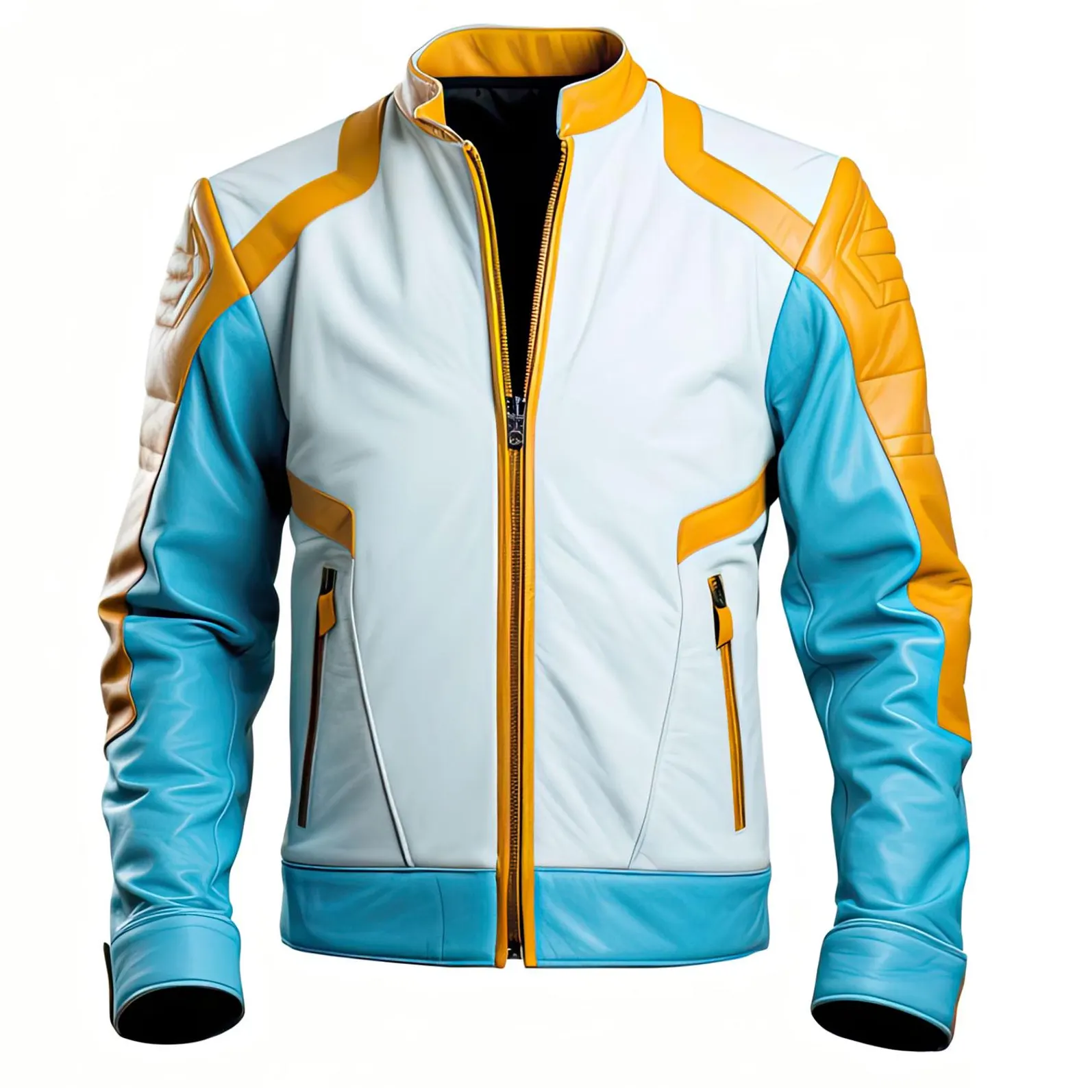 Mens Blue & White Leather Biker Jacket Unique Sheepskin Winter Jacket