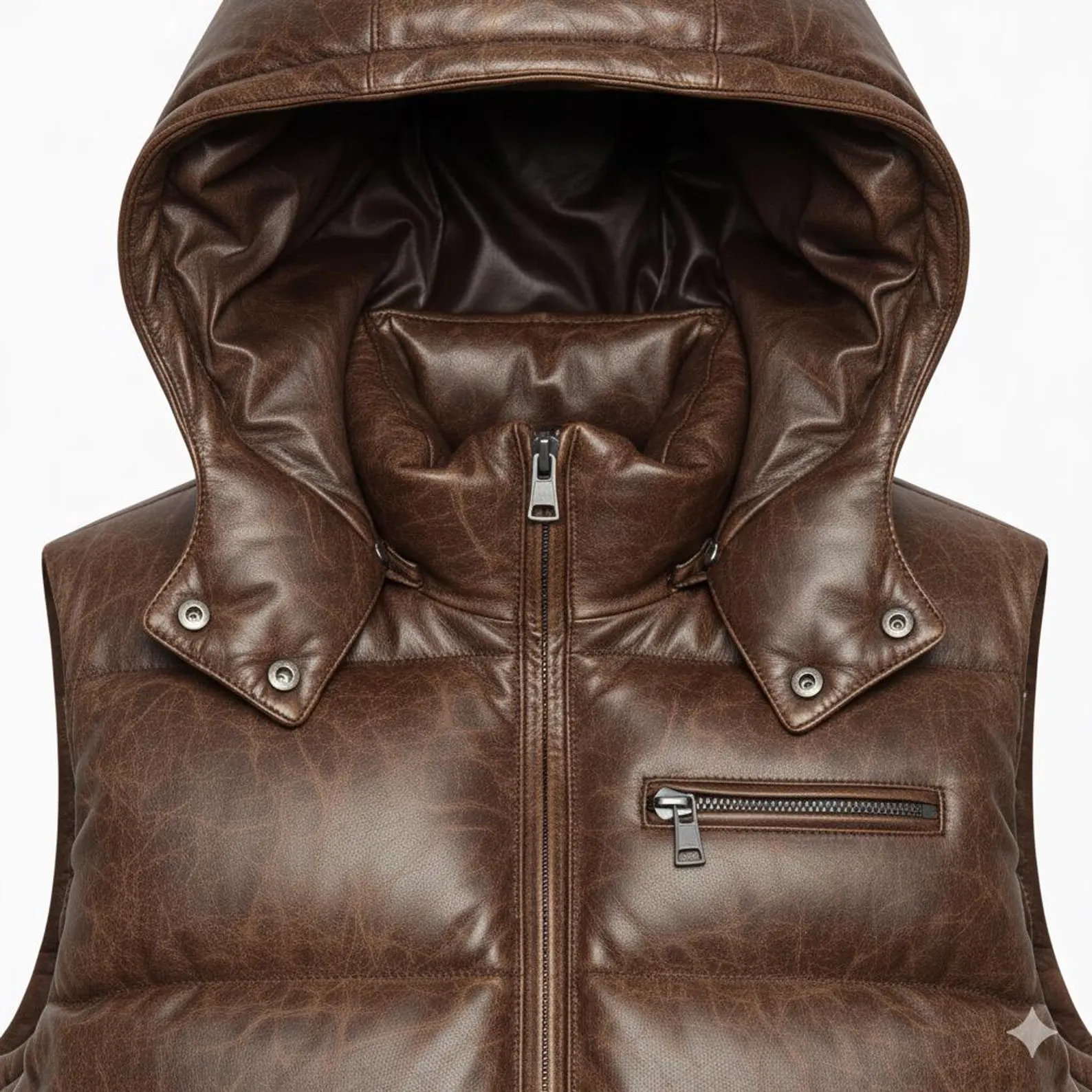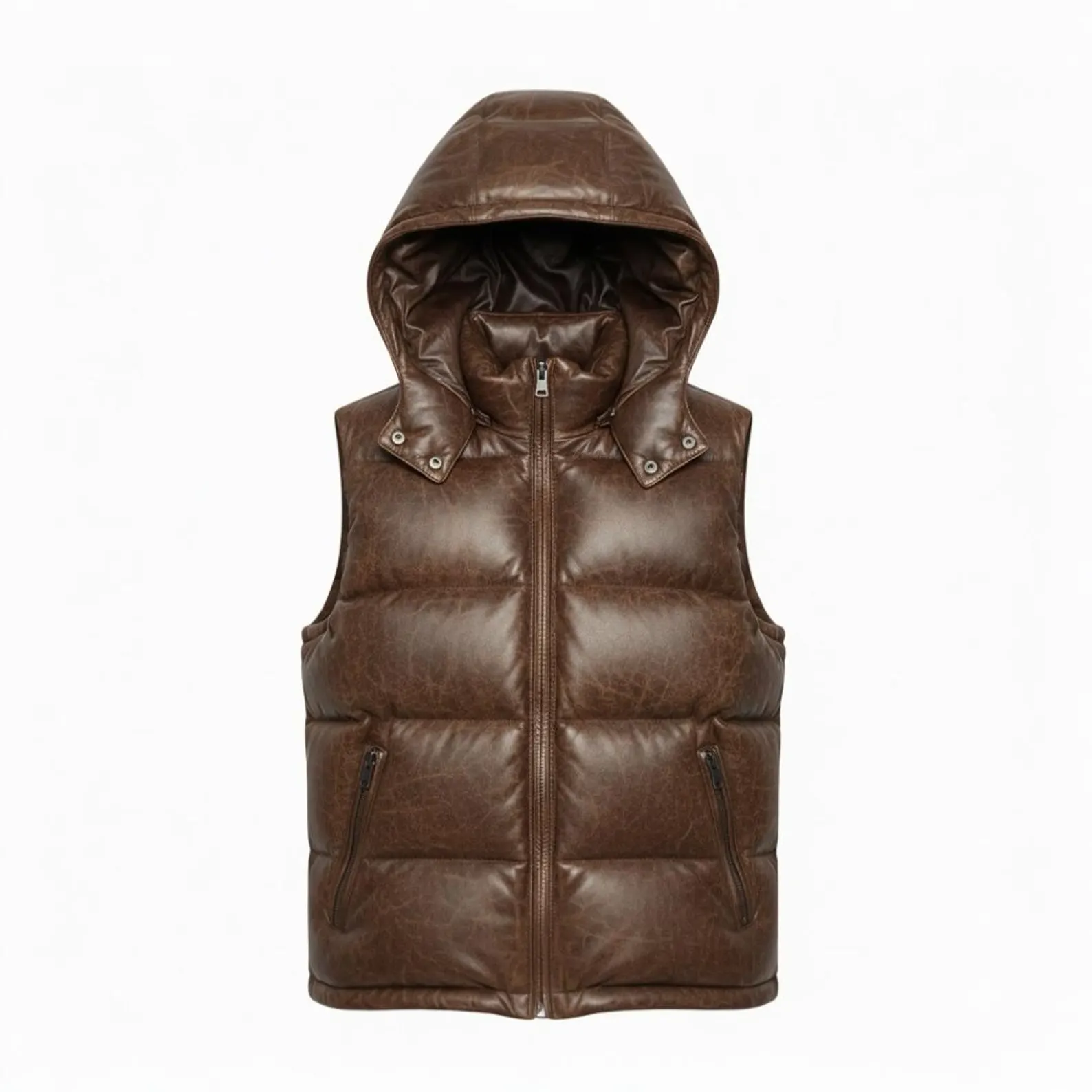 Men’s Brown Hooded Lambskin Leather Puffer Vest Quilted Sleeveless Winter Gilet, designed for modern comfort and timeless appeal. Expertly handcrafted from genuine lambskin leather, this sleeveless quilted gilet offers premium insulation while maintaining a lightweight feel. The detachable hood adds extra versatility, allowing you to adapt to changing weather with ease. Its smooth zip-up front and side pockets enhance practicality, while the rich brown tone delivers a sophisticated, rugged look perfect for winter layering. Ideal for both casual and outdoor wear, this vest brings together durability, warmth, and refined craftsmanship.