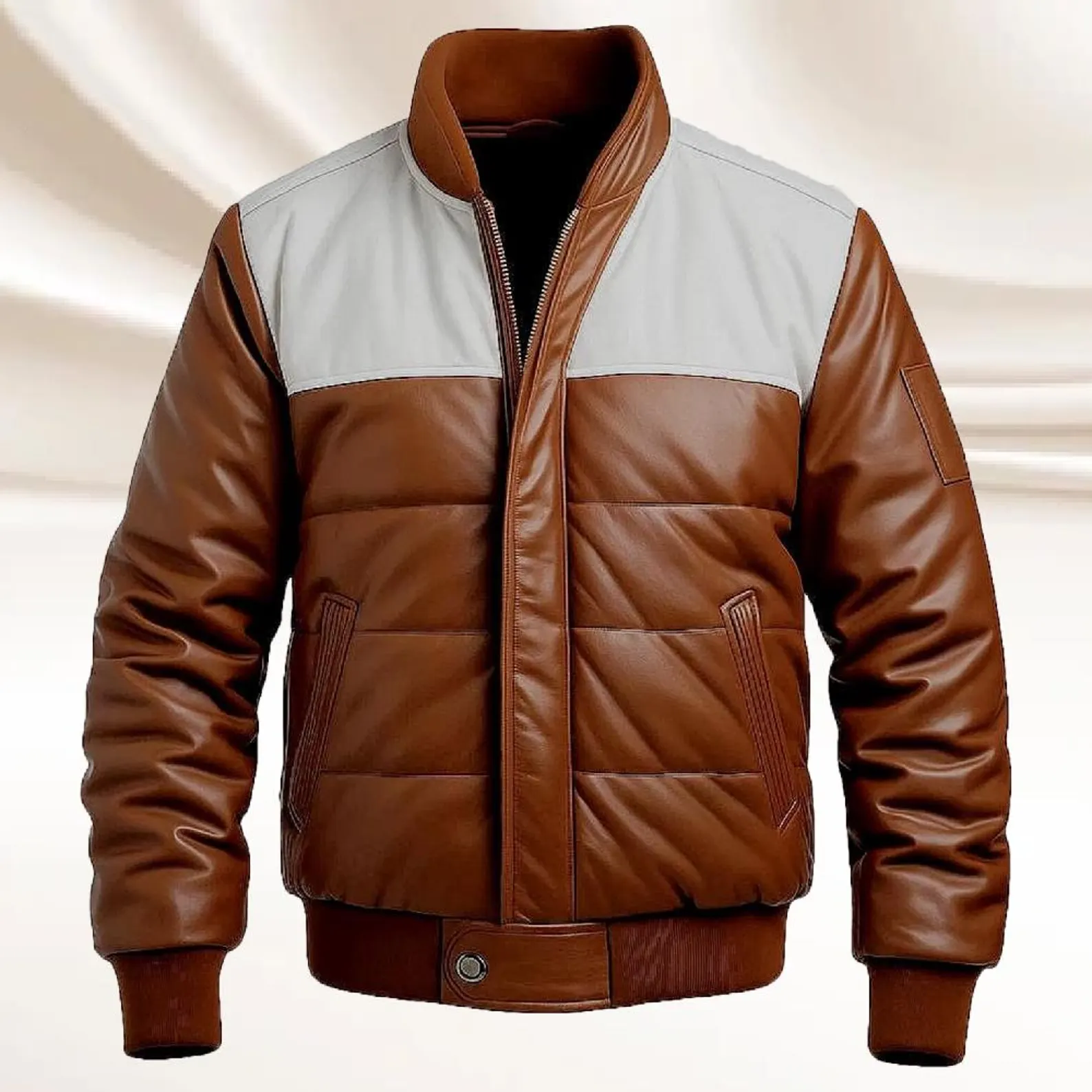Crafted from genuine sheepskin leather, this brown puffer bomber jacket with white accents offers premium warmth, modern style, and a bold winter-ready look.