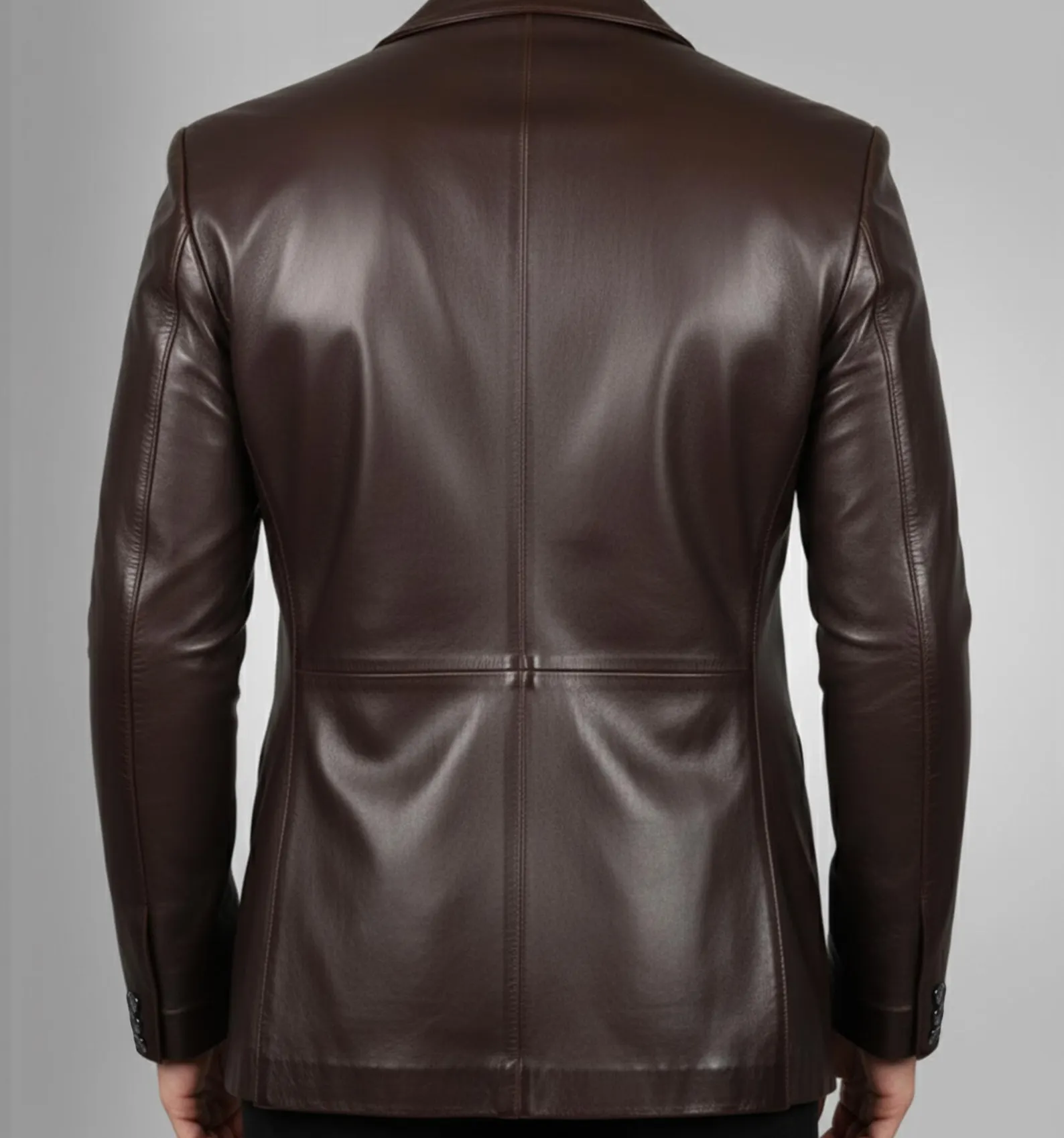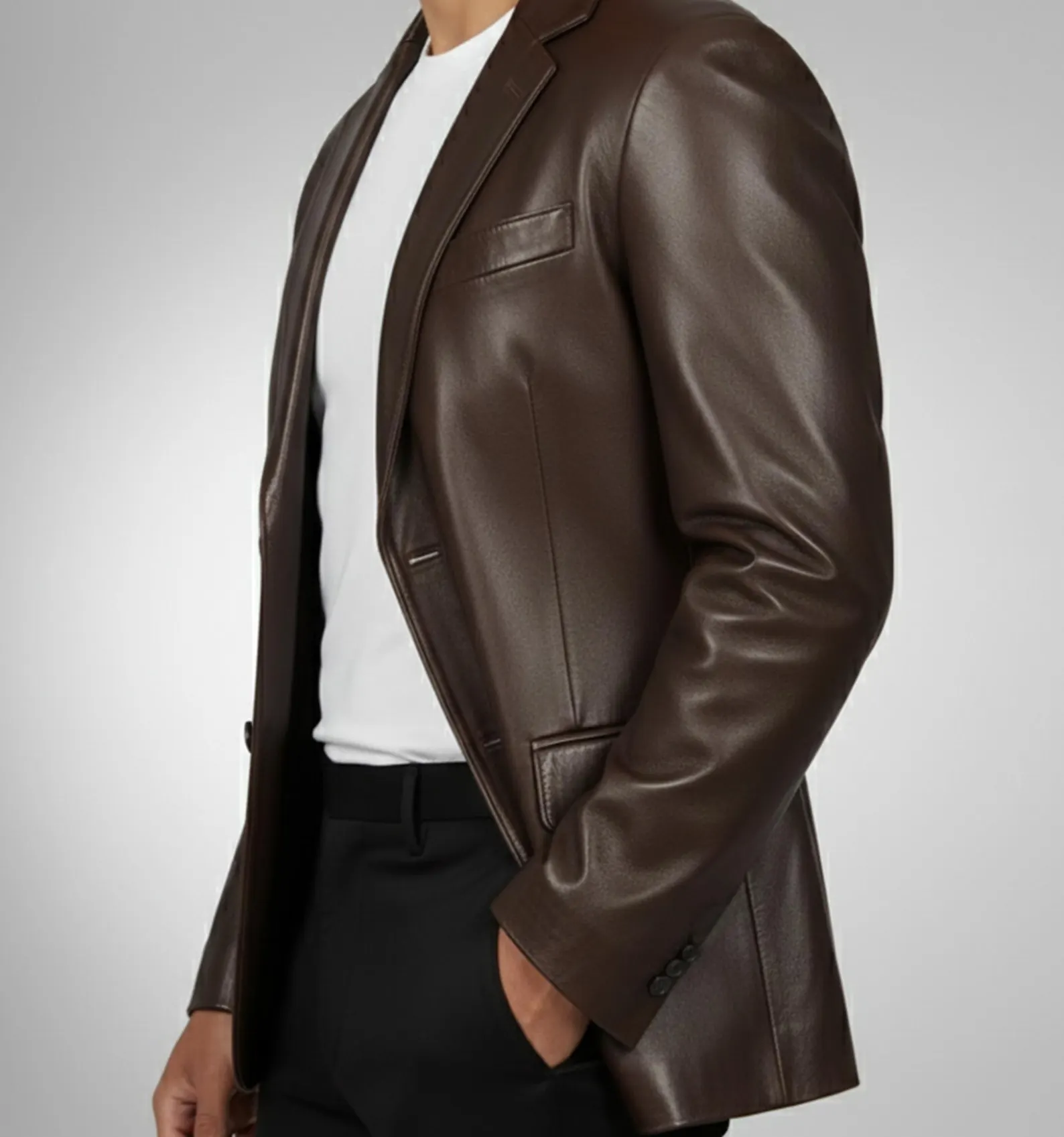 Men’s Handmade Dark Brown Leather Blazer exudes timeless sophistication with its genuine leather construction, tailored fit, and classic two-button front. Perfect for formal or smart-casual occasions.