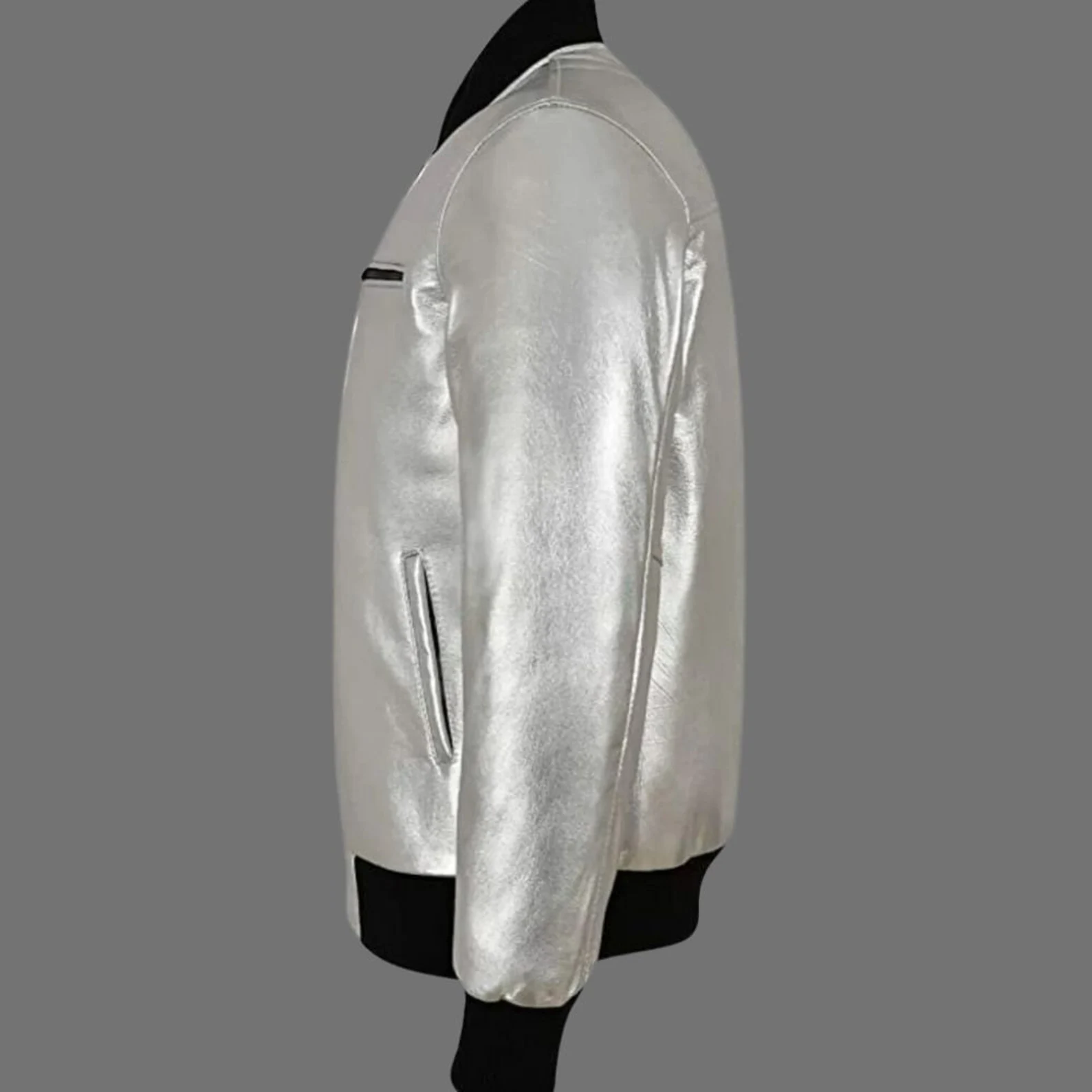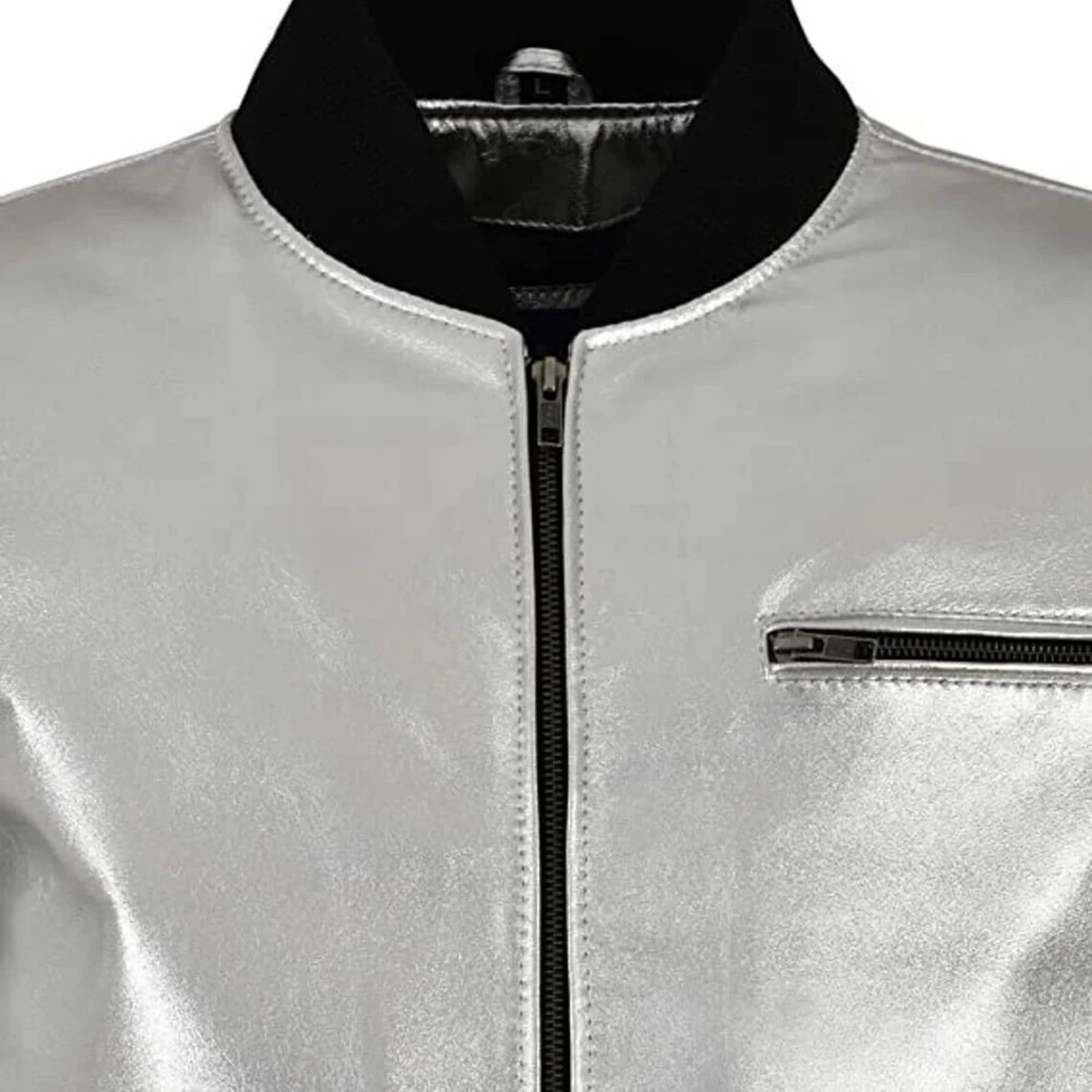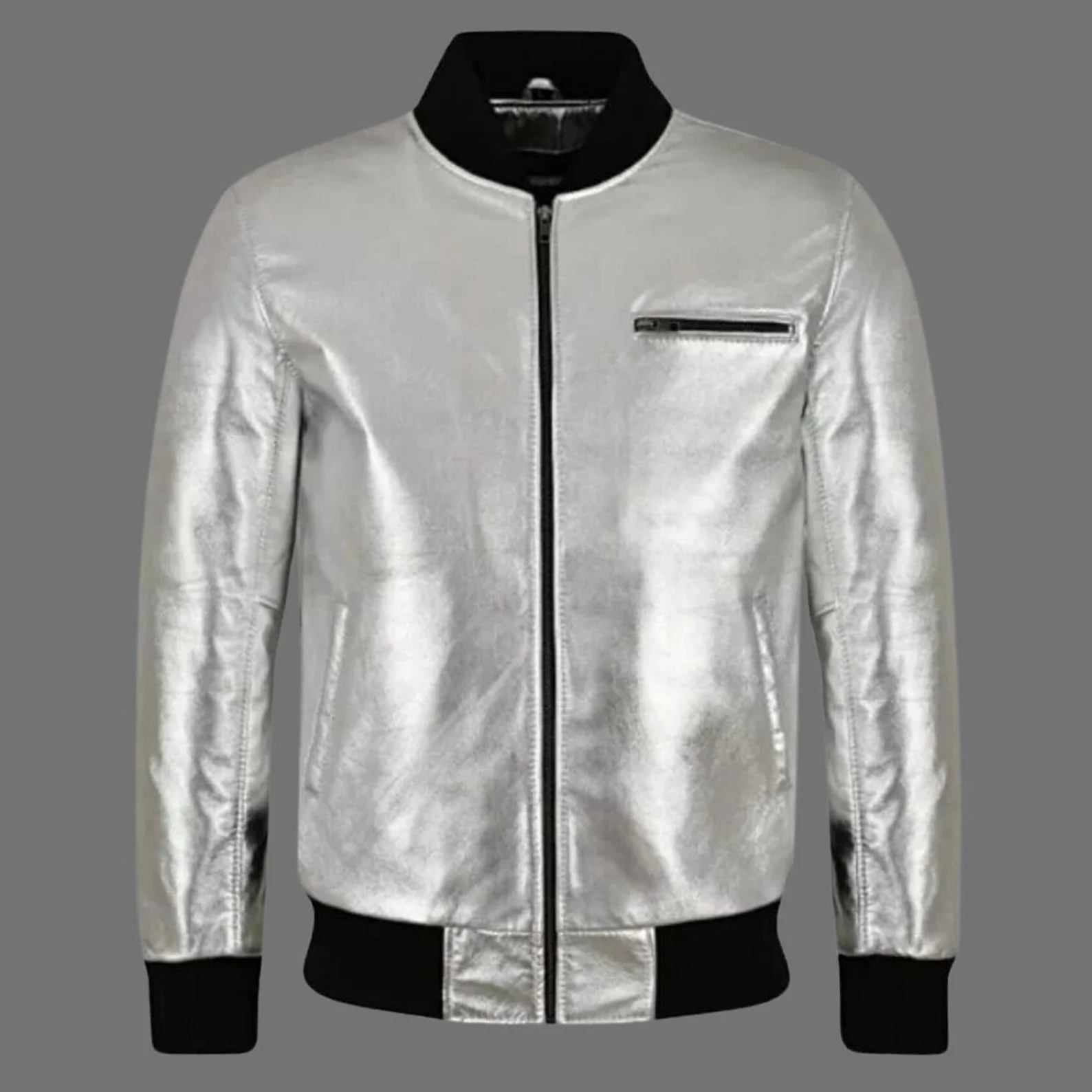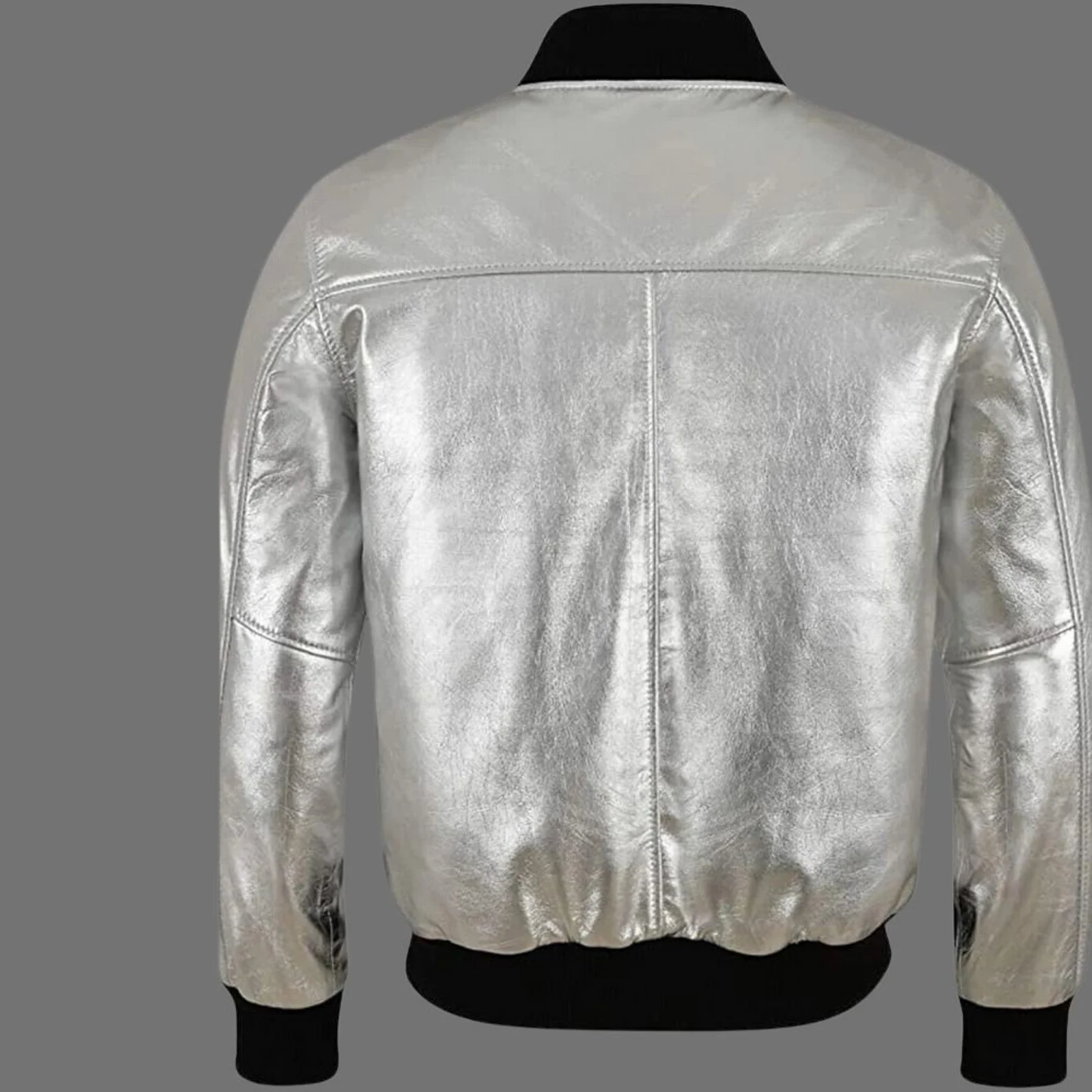 Mens Leather Bomber Jacket Metallic Leather Jacket featuring a metallic finish that brings a bold, modern edge to classic bomber design. Crafted from high-quality leather, this jacket combines durability with sleek urban style, perfect for casual outings, night events, or motorcycle rides. Its metallic sheen ensures you stand out wherever you go.