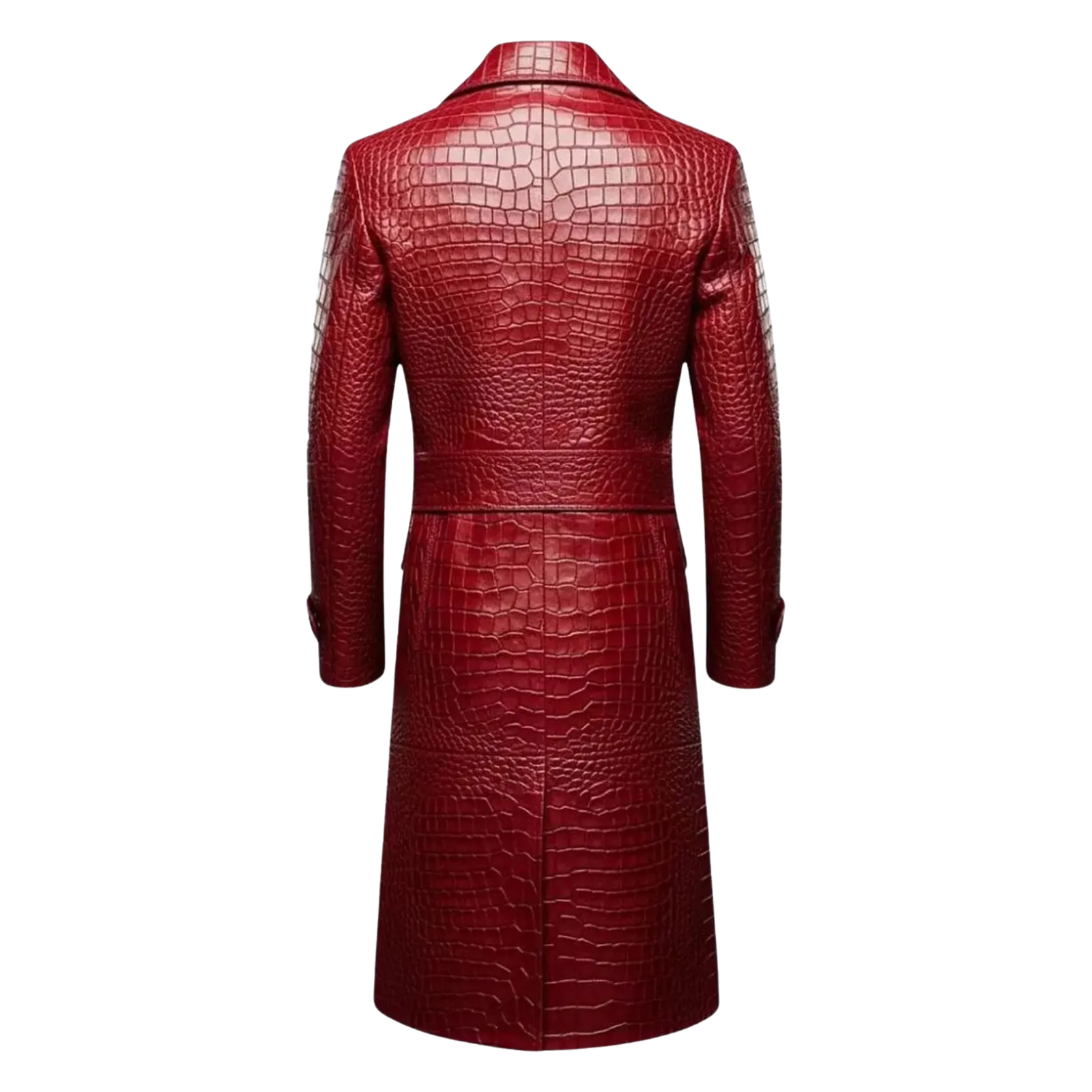 Bold and stylish red leather trench coat with a crocodile pattern, designed in a full-length cut for luxury and modern appeal.