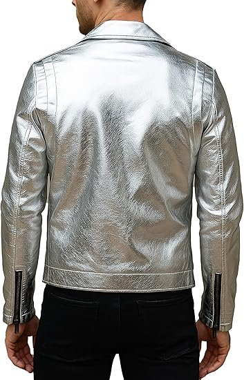 Men’s Silver PU Faux Leather Biker Jacket, designed for those who dare to stand out. Crafted from high-quality PU faux leather, this jacket offers the edgy appeal of genuine leather with a sleek, metallic silver finish that catches every eye.