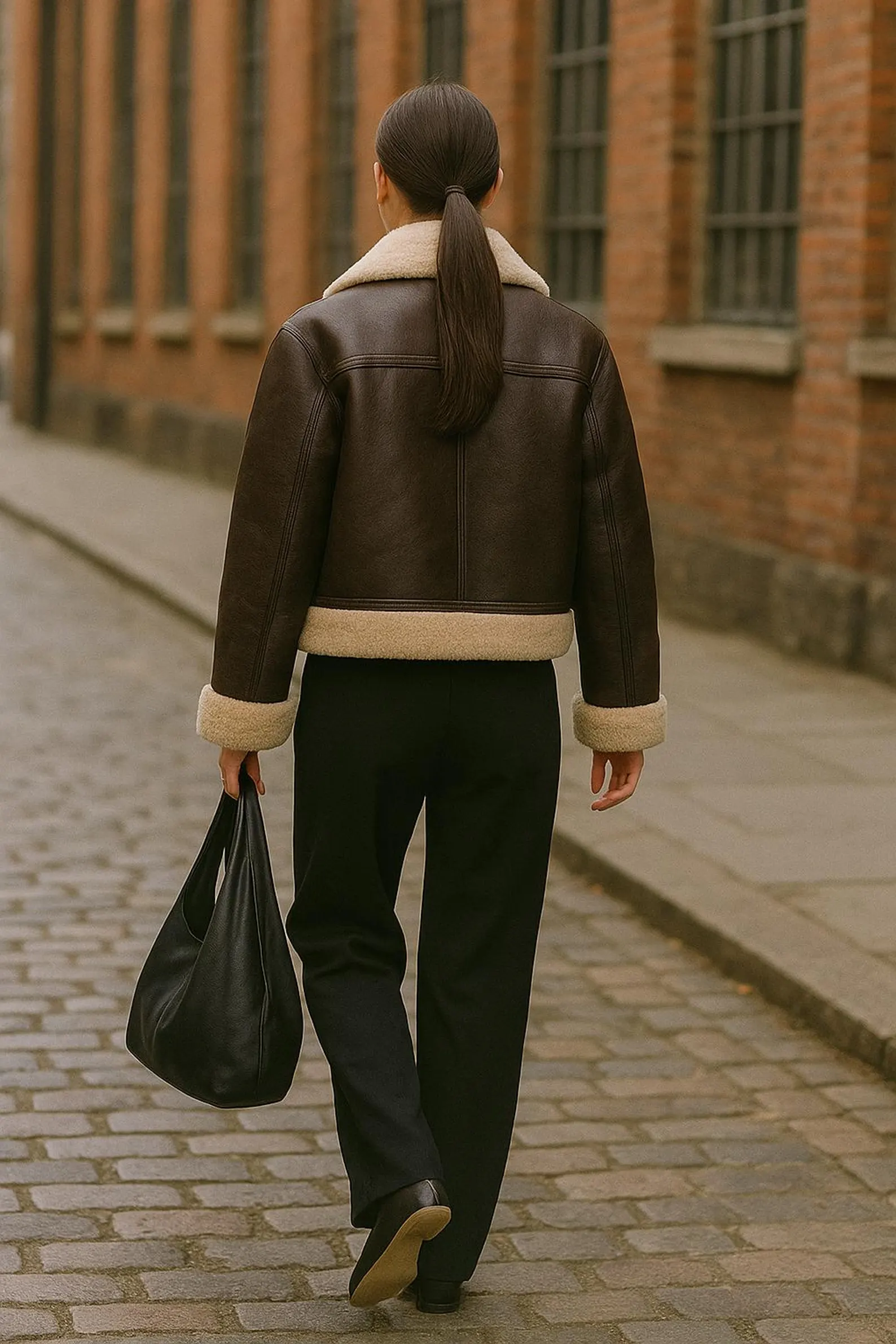 Vintage Brown Shearling Leather Jacket for Women Real Sheepskin Aviator Coat