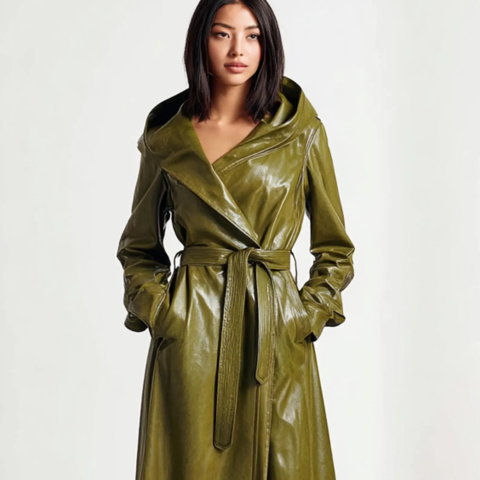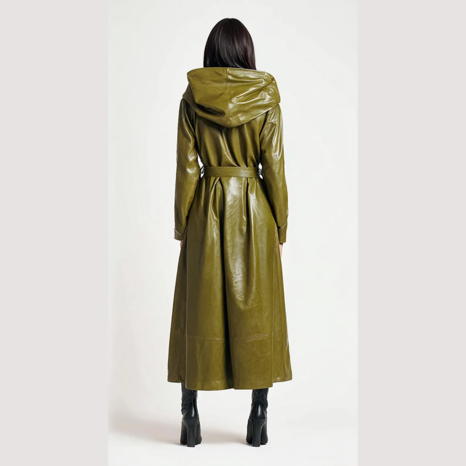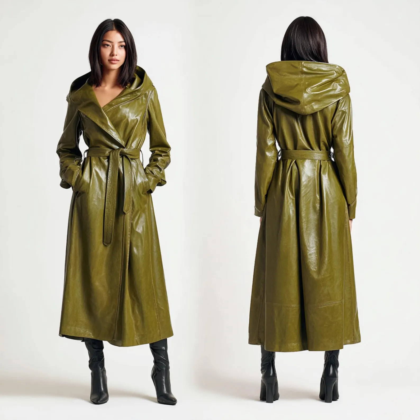Vintage Green Sheepskin Leather Trench Coat Women Hooded Midi Trench Coat. Crafted from genuine sheepskin leather, this hooded midi coat combines classic trench styling with cozy warmth — making it a perfect choice for chilly seasons. The elegant vintage green tone adds a unique flair, offering a fresh alternative to traditional neutrals while maintaining sophistication and versatility.
