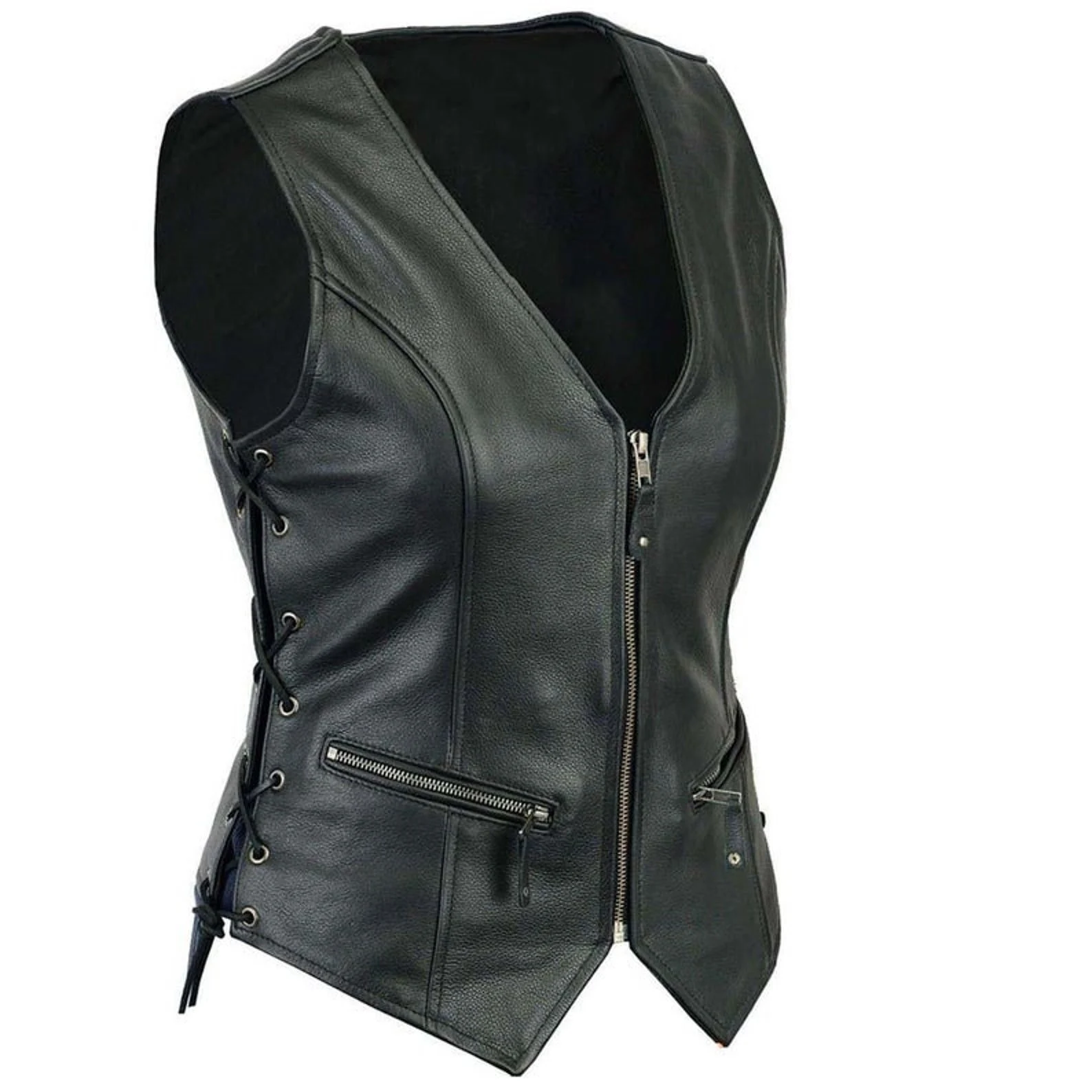 Women’s Black Genuine Leather Laced Motorcycle Vest Zipper Front Biker Style