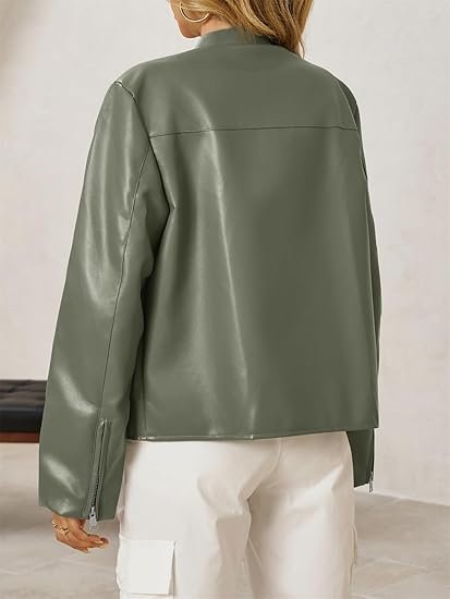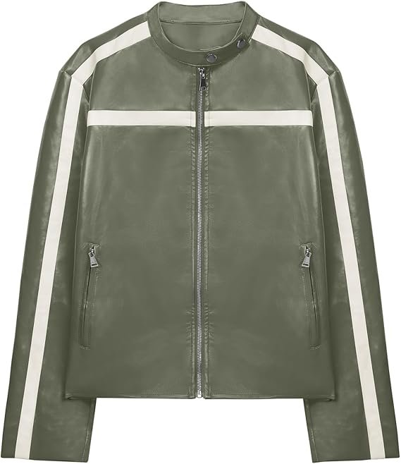 Women’s Grey Faux Leather Racer Jacket with White Stripe, a chic fusion of sporty edge and timeless sophistication. Crafted from premium-quality vegan leather, this jacket delivers both durability and modern flair. The soft grey tone paired with crisp white racing stripes on the sleeves creates a sleek, moto-inspired aesthetic perfect for casual outings or an urban-chic statement.